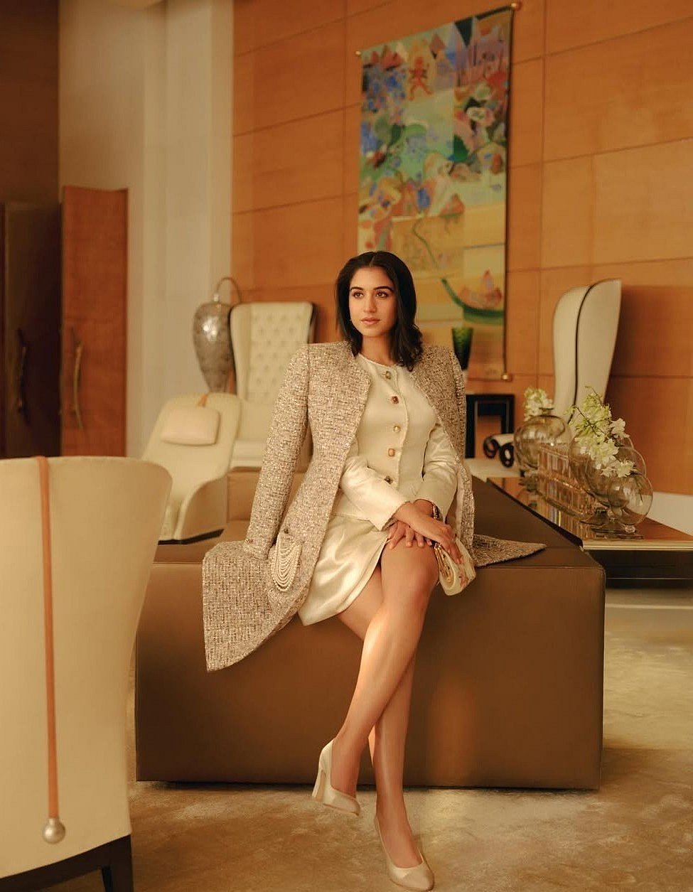 Radhika Merchant stepped out in a bespoke Chanel creation inspired by the maison's iconic Paris-Bombay Pre-Fall 2011 collection that honoured the French luxury and Indian opulenceAt the heart of the look was a satin-finish ivory top, featuring strong shoulders, a modest neckline and a neatly buttoned bodice, paired with a knee-length skirtLayered over the co-ord set was a long, textured tweed coat, adorning a delicate chain accents and subtle embellishments