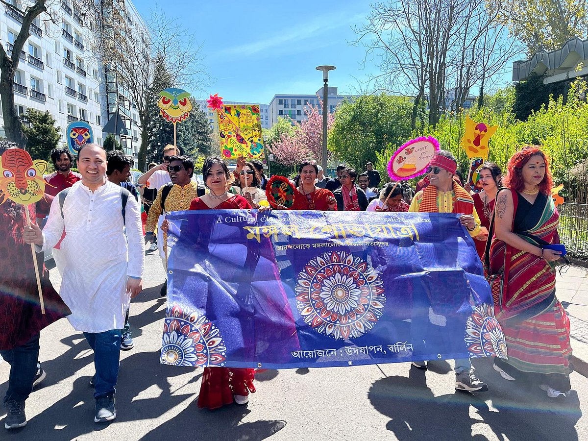 মূল অনুষ্ঠান শুরুর আগে অন্যতম আকর্ষণ ছিল মঙ্গল শোভাযাত্রা। বাদ্য বাজিয়ে বাঙালি সংস্কৃতির নানা প্রতীক আর রঙিন পোশাকে বার্লিনের রাজপথে পথচারীদের নজর কেড়েছিল।